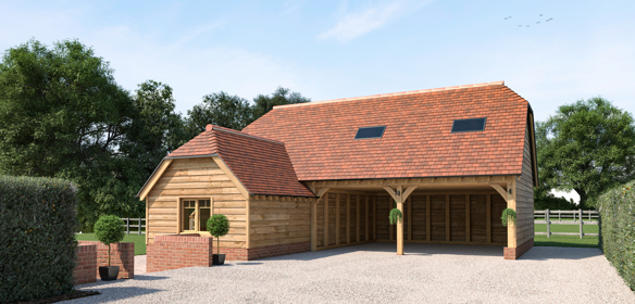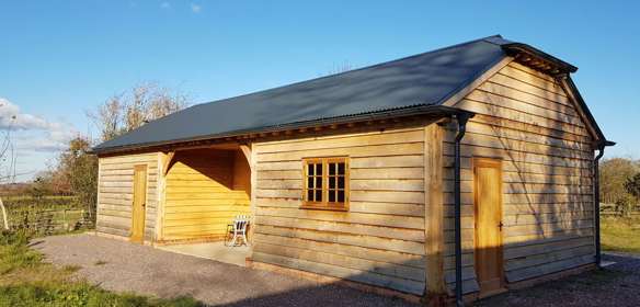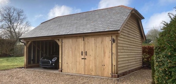 Despite some pretty stormy weather of late, we are delighted to have finished this lovely two bay garage for some local clients. Clad in oak and with a slate tiled roof and a loft floor, one bay is open and the other enclosed behind a pair of bespoke barn doors.