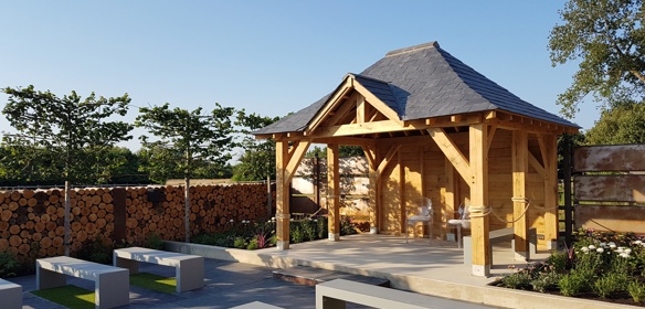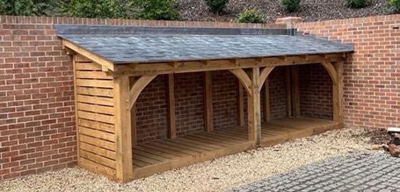 This rather nifty two-bay oak framed log store is just over 5.5m in length and stands 1.25 metres tall. It has a slate tiled roof and ventilation slats so our clients' stash of logs will be kept both dry and suitably aired in preparation for the winter to come.