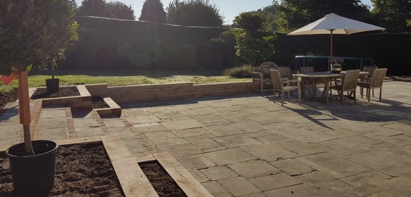 What an amazing Summer we're having...and it's so lovely to be working outside for this Hampshire client, building them a large new terrace with brick edged steps and oak sleeper planting beds. They couldn't wait for us to finish before setting up the table and chairs!