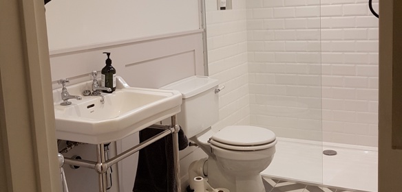 We've stolen a little bit of space from a bedroom to build this stunning en suite shower room with roof light, white subway tiles on the walls and geometric concrete tiles on the floor (with underfloor heating). Refurbishing the bedroom to the same standard has provided our client with a top class self-contained guest bedroom suite.