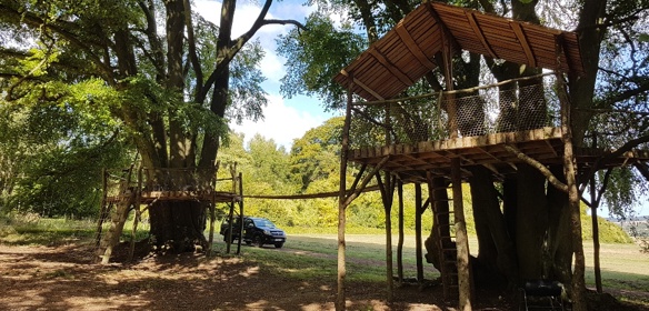 This unique project was for us to build a pair of treehouses high off the ground, using as much natural timber as we could from the surrounding woodland, felled and prepared onsite. The two platforms are linked by a rope bridge that can be driven under and include climbing cargo nets, hinged door hatches, natural wood ladders, a shingled roof and a zip wire ride!