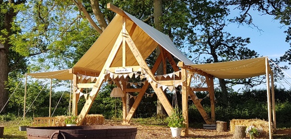 Our latest new product is this oak framed marquee with canvas cover. Here it is being set up as a 'Woodland Bar' for a wedding, to complement the main marquee. It's perfect for parties or any form of outside entertaining! Sides can be rolled up or winged (as per image) and this one is available for hire for your event. Or you can commission one unique to your needs.
