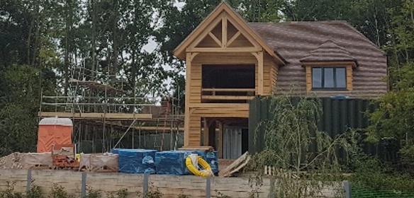 Building this new house in two phases was always the plan and, only 3 days into the second phase of the build, the side extension oak frame is already up to first floor level. Beautiful sunny days definitely help!