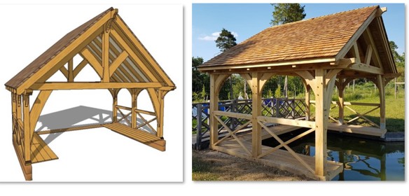 We've just put the frame up for this gazebo. When complete, it will have a tiled mansard roof, solid oak rafters with oak sarking boards above (so all you see from inside is lovely honey-coloured oak) and a brick built wall with a traditional log burner; beautiful to look at and warm and cozy!
