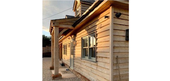 Feels good to see the finishing touches completed on this Surrey 6 bay barn with dormer windows on the first floor, a welcoming porch over the front door and oak cladding all over. Our clients are thrilled with the flexible space this annexe provides and sent us this lovely image of it catching the evening sun.