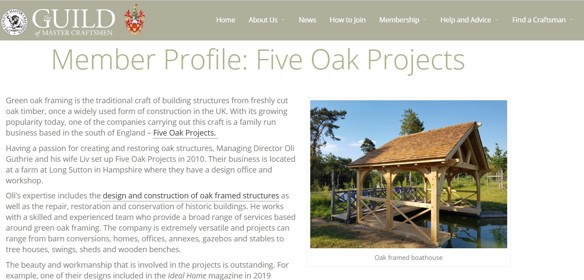 We are delighted that The Guild Of Master Craftsmen chose to focus on us with a Member Profile piece just posted on the News section of their website this weekend (https://www.guildmc.com/news/member-profile-five-oaks-projects/). The feature touches on a number of our completed projects, and highlights the diverse range of skills and huge variety of structures we've had the privilege of building over recent years, as well as some of our latest work on restoration and conservation projects.