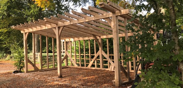 The frame for this impressive log store took just two days to construct - two very wet days as it happens, but that didn't stop progress. It goes to show how quickly a structure can be built using an oak frame once all the groundworks have been completed. The frame looks stunning here in the sunlight - which came out after the build was completed, of course!