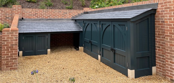 Very satisfying to have just finished two projects at the same time for our clients in Farnham; this lovely garage and a separate store room. The garage is oak framed, oak clad and features oak sarking boards in the roof with clay tiles on top. The store room also has an oak frame, a shingle roof and a range of bespoke barn doors with handmade ironmongery.
