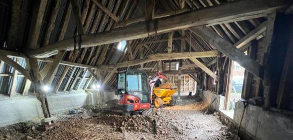 Works are well underway on the restoration of this beautiful Berkshire barn as we dig out the old concrete flooring. The effect of concrete on timber posts is that it traps moisture and rots the wood which, in this case, means the main supporting posts are floating in space. This is not good!