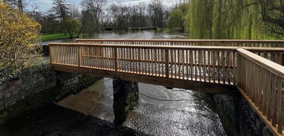 The original bridge over the river to the sluice gates were made of metal and had badly rusted. With nothing worth salvaging, we handmade a completely new set of railings with angled mullioned spindles and matching handrails giving the finished bridge a new lease of life.