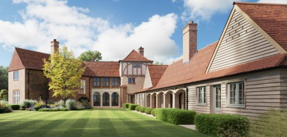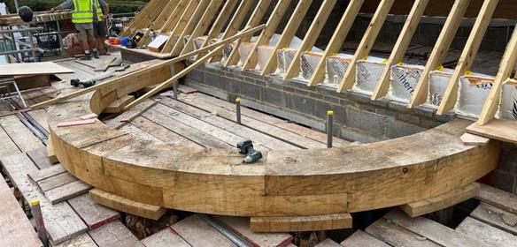This new build property has been a really interesting and complex project for us to be involved with as we dip in and out depending on the progress the builders have made onsite. Our role is to make and install all of the oak work to include loggia's, windows, columns and all of the decorative features shown in this CGI of the finished building. Currently, we are looking at the oak frame for the turret, which includes a huge curved brace.