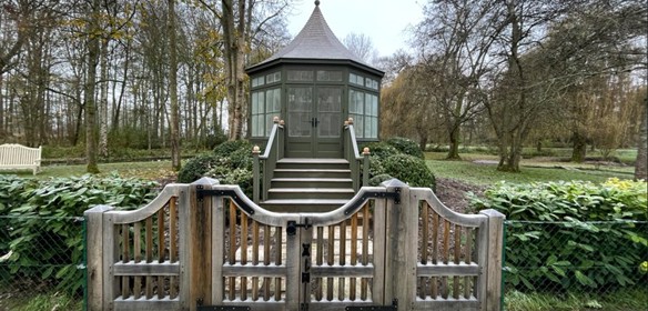 Back to one of our favourite clients, where we are lucky enough to get to design and build some really lovely pieces around and about the estate. We hand made these oak gates a little while ago (hence the aging) and returned recently to make and install the steps and stone plinth leading up to this little gazebo.