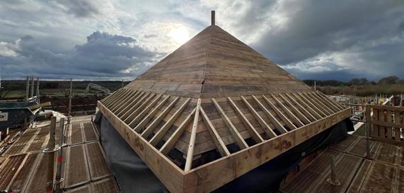 Stripped of its cladding, we start to see the bare bones of this listed granary so we can see what repairs we need to carry out to ensure the structure is stable and solid for the next 100 years. Once the frame restoration is complete, the building will be re-clad, re-tiled and painted black - as it would have been originally.