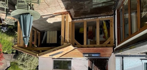 Ryan is taking the lead on building this oak framed extension and has launched the drone during one of the rare moments of sunshine recently to get this shot. The roof is all cedar shingles with Velux windows to maximise the light inside, with 4 leaf bifold doors and windows still to be installed to complete the look.
