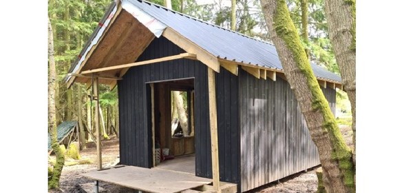 Oli and Dave have been building this cabin in the woods using a softwood timber frame, metal roof and blackened timber cladding (which is burnt to achieve the desired look and finish). A few bits to finish off still to include installing windows and doors, decking with railings to the veranda at the front and an exposed timber truss above to complete the look.