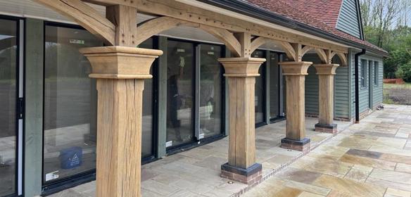 Square oak columns with decorative capitols and arched braces are installed here to create this impressive covered veranda...just one of many high end oak details we have added to this large new build in Dunsfold to enhance the overall look and quality of the finished property.