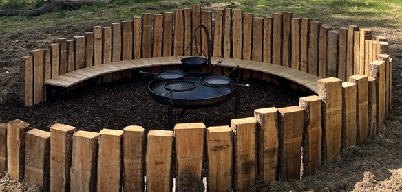 A sunken firepit, created using staggered rustic timbers to create a large circle with floating seating all around to make a fantastic entertaining and social space.
