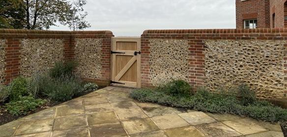 Adding the finishing touch to this beautiful flintstone wall, this bespoke oak panelled gate with hand forged ironmongery is evidence of the care and consideration given to every aspect of this new build project.