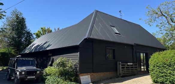 This lovely old Hampshire threshing barn is a listed building that was in need of some emergency roof repairs to one hip end and ridge, as visible in this image. With the approval of the local conservation officer, we stripped back the tiles and replaced all the missing and rotten battens. The tiles and ridge bonnets were then replaced using lime mortar and stainless steel fixings. We will return to carry out more non-essential repairs to the doors and cladding in the near future.
