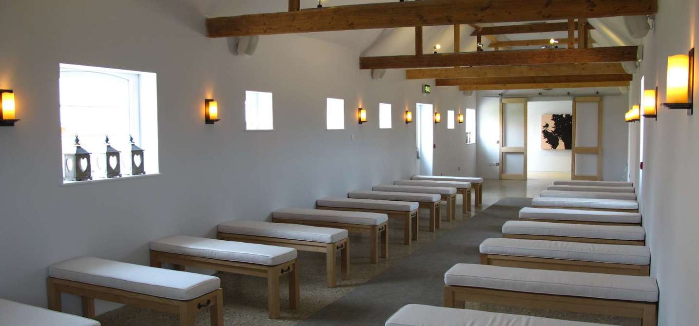 A vaulted ceiling exposes the timber trusses restored during the renovation of this Victorian brick and flint built dairy building, turning it into a wedding ceremonies room at www.southendbarns.co.uk.