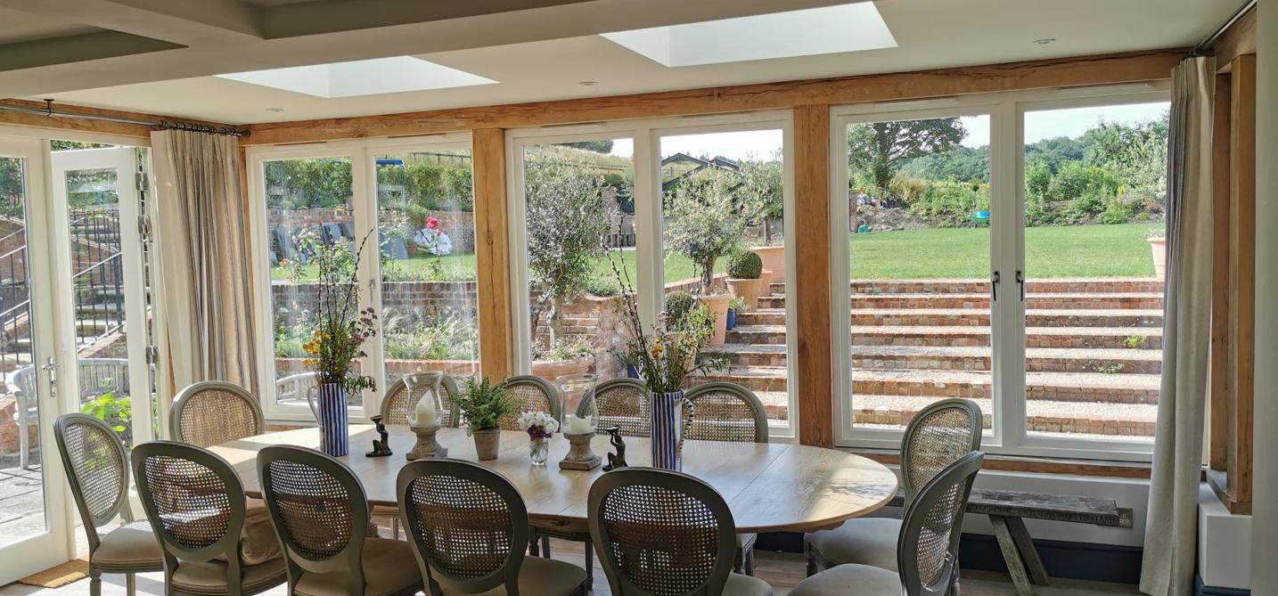 This green oak framed extension was added to the kitchen to create a generous and light-filled dining room. Doors at either end lead onto the rear patio and three-quarter height windows connect the house with the large garden.