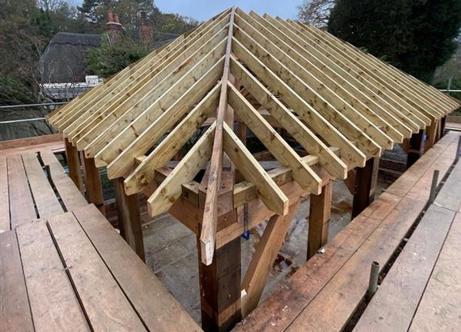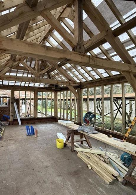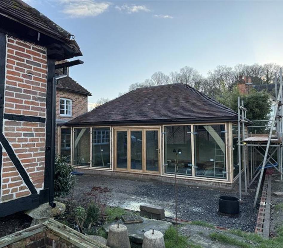 Demolishing an existing conservatory created the space for us to build this oak framed kitchen extension, linked to the main house by a glazed entrance. The new kitchen will be filled with light from the full height windows and doors.