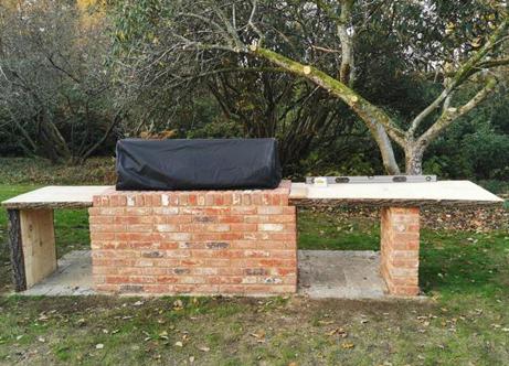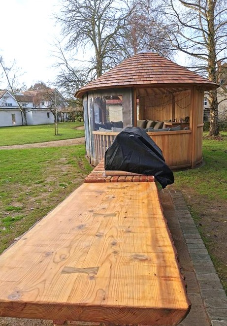 This bespoke oak frame has a standing seam metal roof and has been designed and built to house an outdoor kitchen and bar. Our clients couldn't wait to christen it and had a party before all the units, BBQ, sink and fridge were installed, but at least were able to benefit from the installed lighting and rain protection the frame alone provided.
