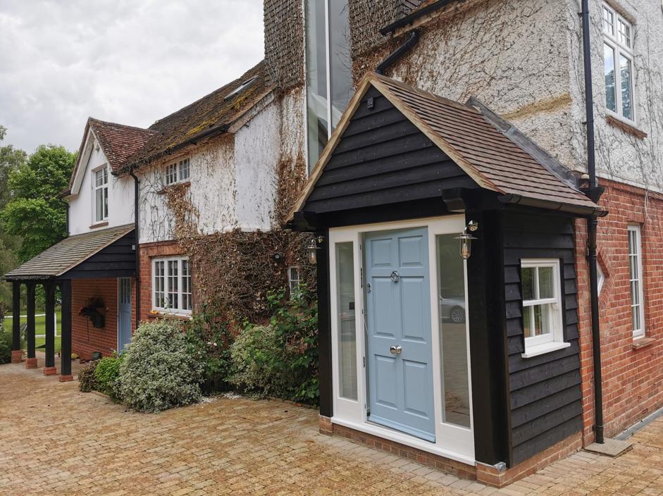 Fully insulated porch extension with black stained cladding, a new side window and full height glazed panels either side of the front door to let in plenty of light.