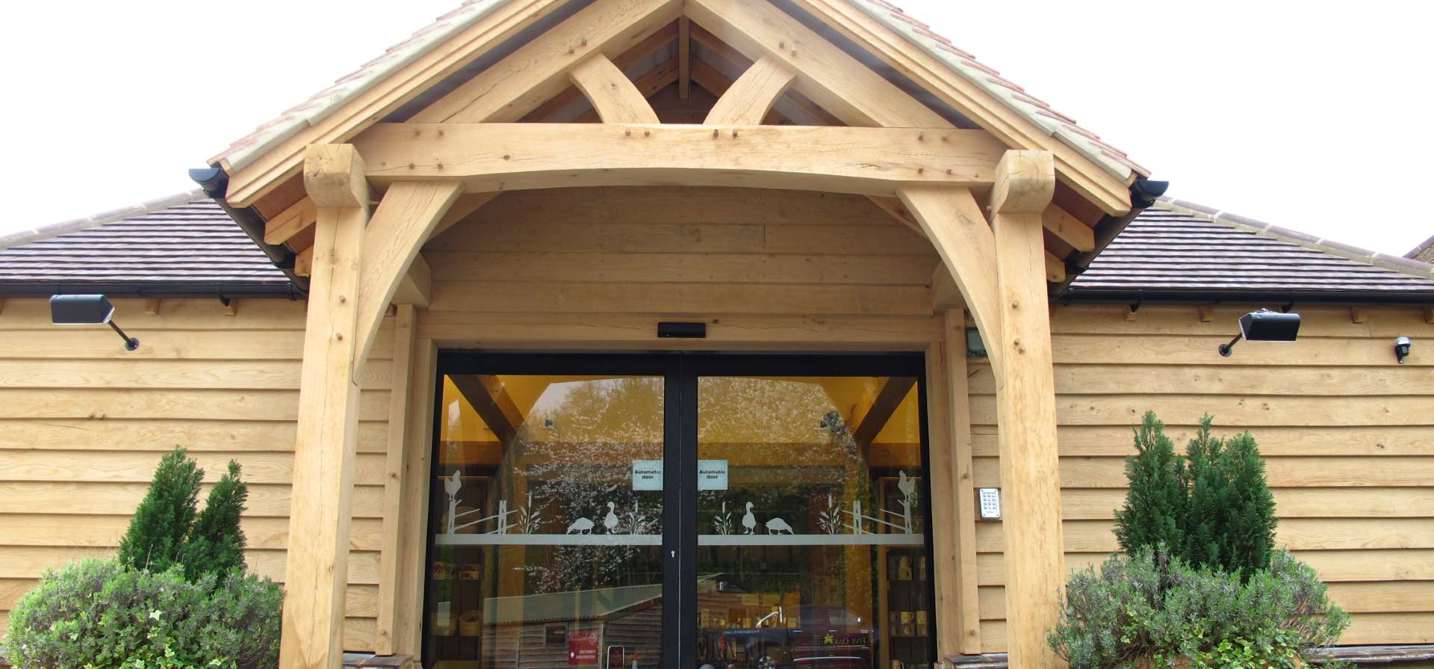 An old plastic 'lean to' wasn't creating quite the right impression as the entrance to this busy Surrey farm shop, whereas this replacement solid oak frame addition does. It also provides additional display space and has the added bonus of being fully weatherproof (compared to the structure it replaced!).