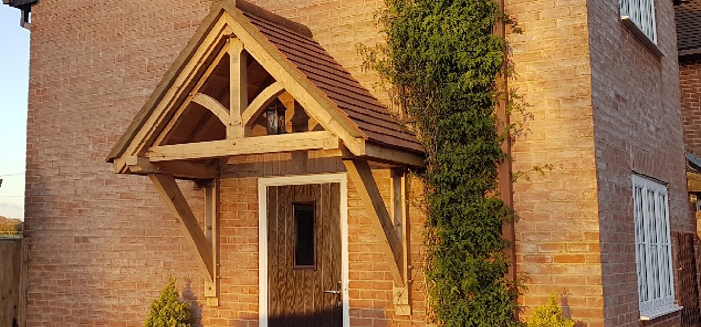 Adding a beautiful oak framed porch to this new build house adds character and practicality. Built on a brick plinth, with glazed panels into the apex and a solid oak front door, the porch itself is recessed under the tiled roof behind two oak posts standing proud, finished with a wide flagstone step.