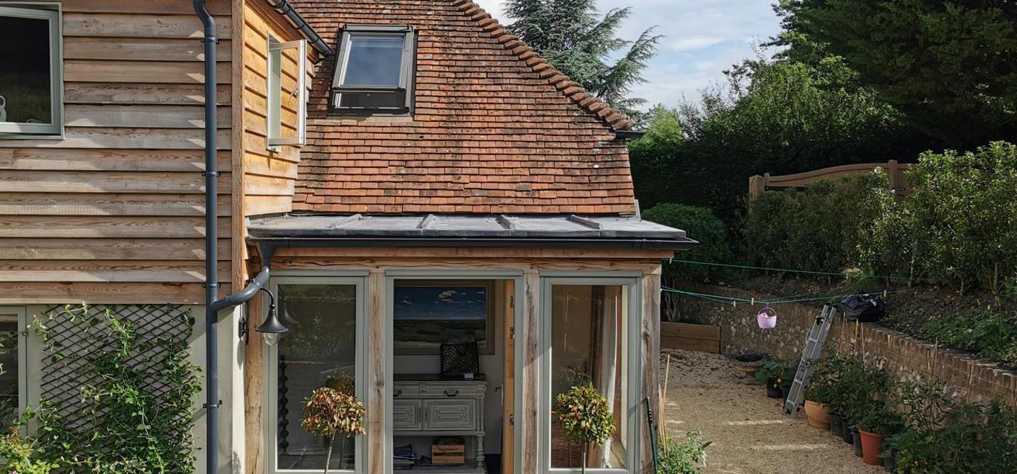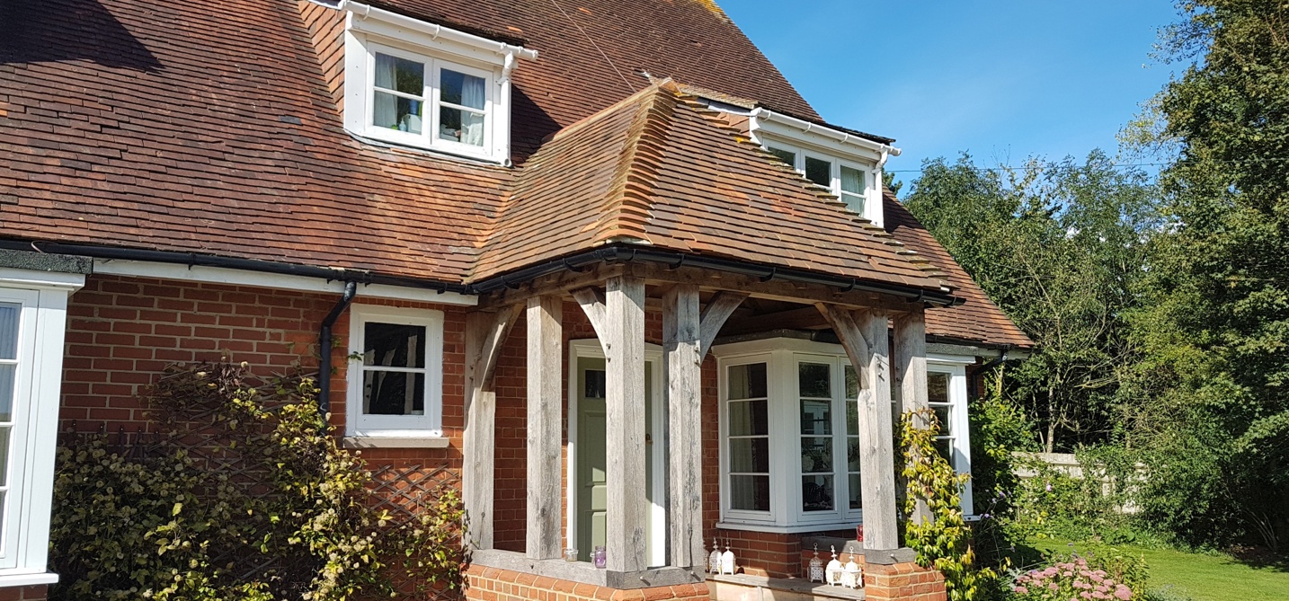 Replacing an existing but dated porch gave this house a much needed and appropriate facelift. Careful handling of the roof tiles during construction meant we could re-use them so the new roof fits in seamlessly. Shown some time after completion, we see the oak now weathered down to a gorgeous silvery grey.