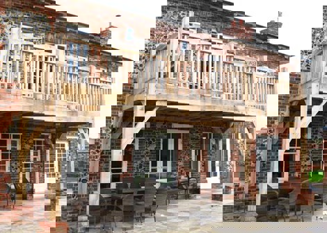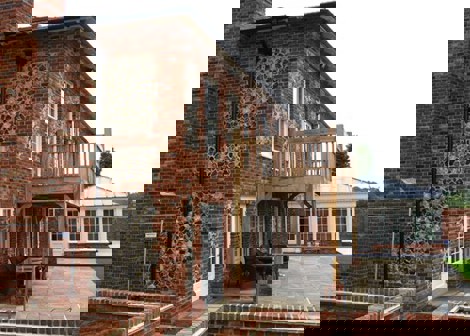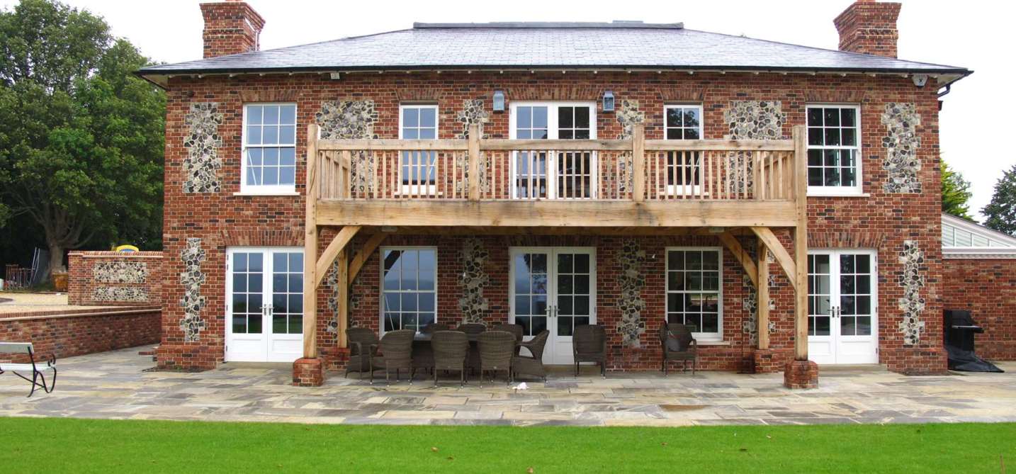 We designed and provided the oak for this stunning triple-width balcony for this new build West Sussex flintstone house. Providing a covered dining area beneath, it sits on brick staddles and was constructed by the onsite construction team.