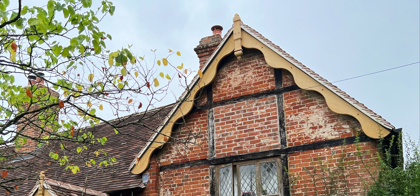New oak barge boards and decorative finials grace the three gables of this Grade II listed house. The hand carved curvy shape replicates what was there originally, but will be left untreated to weather down naturally.
