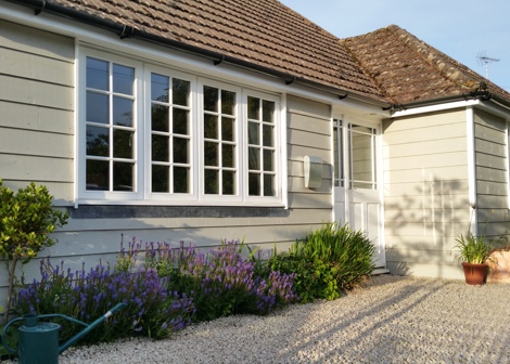 Just a few simple changes to this bungalow has transformed it. New windows, doors and painted cladding brings a tired building back to life, aided by a little landscaping.