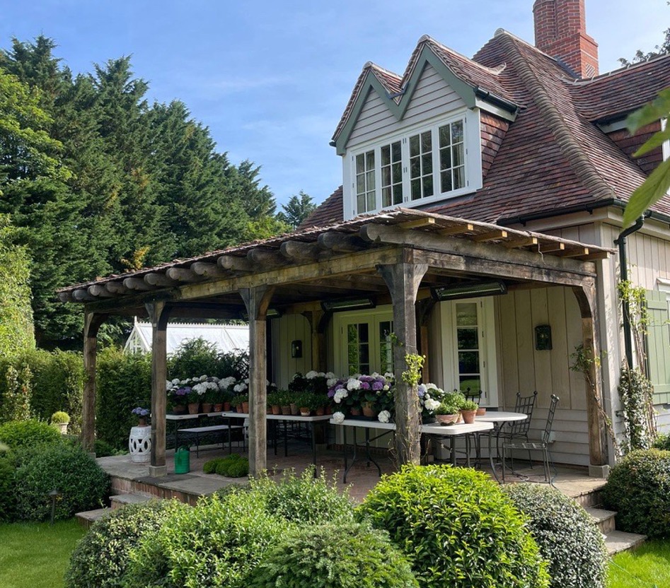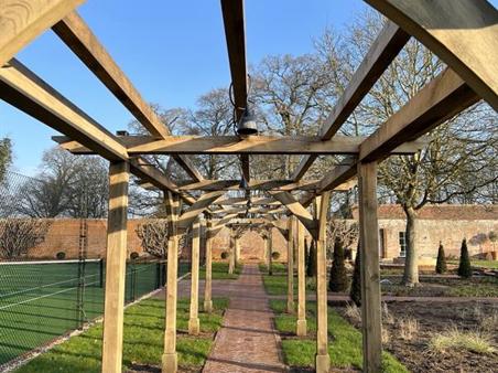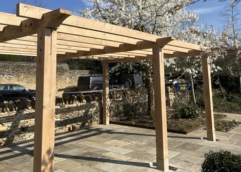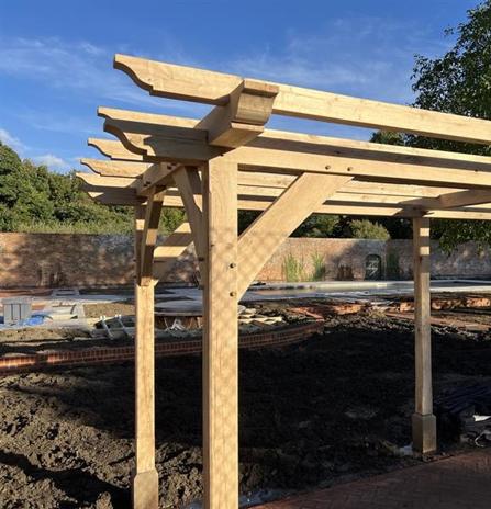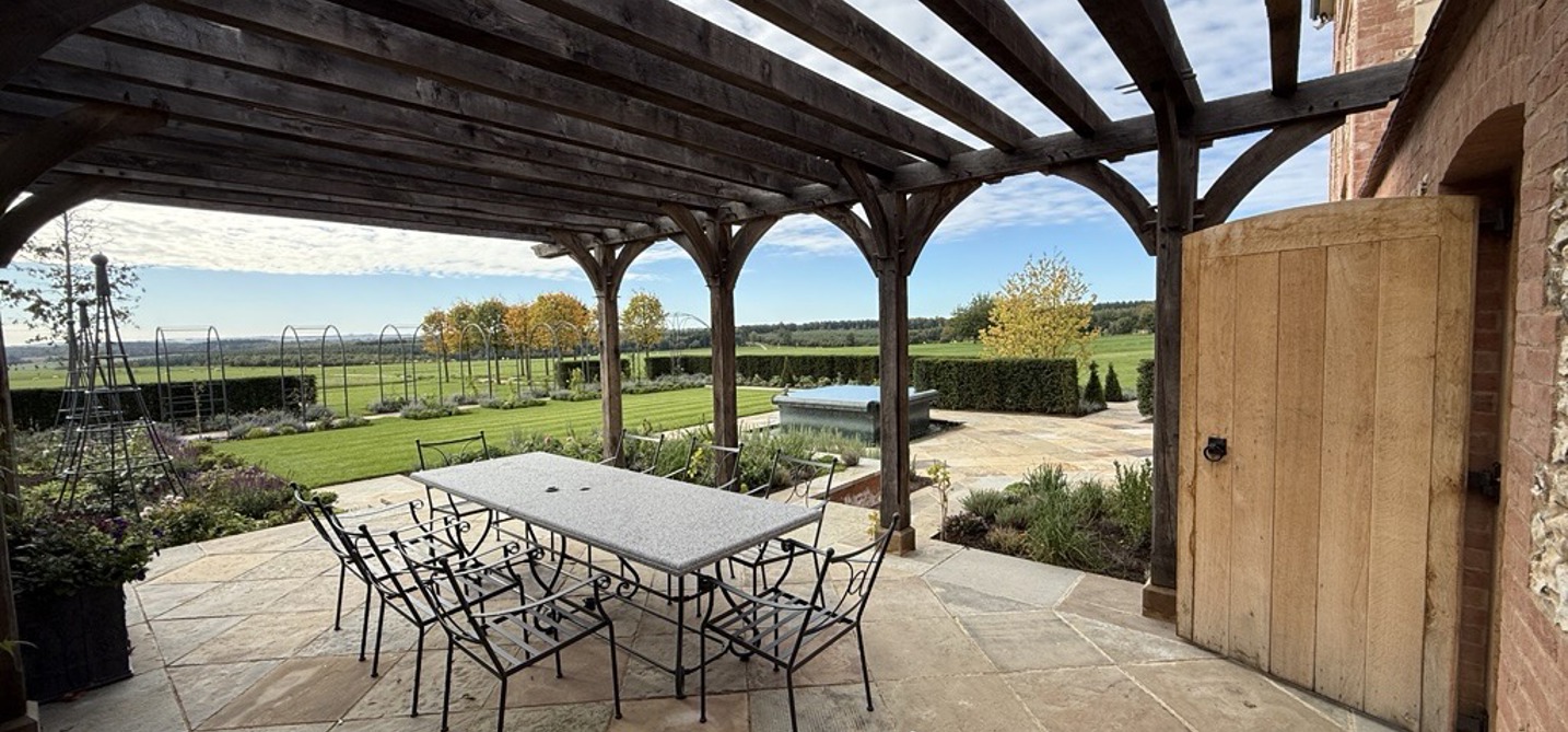 Sitting on a bespoke raised terrace, this pergola was designed to create an outside dining area. It features hand cut decorative ends on the joists and eaves beams, curved braces and posts set on stone staddles.