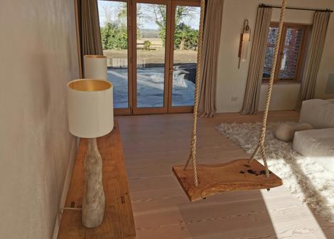 Who doesn't want an inside swing? This one hangs with a view from either side and has been made using a knarly old piece of oak that is uneven and full of knots. Holes have been filled with black epoxy resin and the rough edges sanded just enough to give the seat a smooth finish.