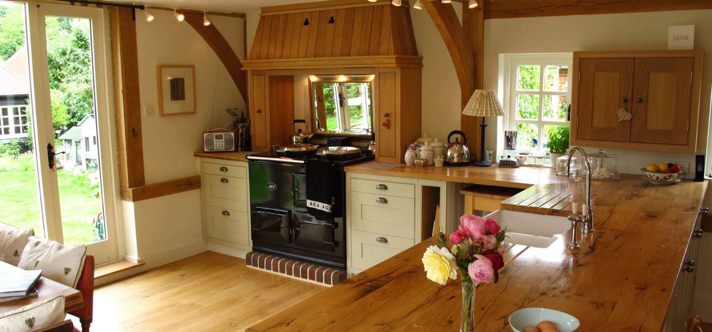 Our clients are delighted with this quality custom built country kitchen, with lacquered weathered oak work surfaces, fitting perfectly in their oak framed extension. With thanks to our friends at www.riverwoodwork.com.