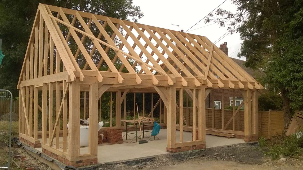 It took just one day to construct the frame up to roof height for this single garage and all done onsite with just a couple of experienced guys. The finished building will have a vaulted ceiling lined with oak sarking boards, with a clay tiled roof, and the walls will be clad with oak featheredge cladding (more pics will follow). A very quick and satisfying project for our guys to work on.