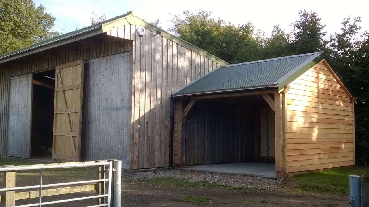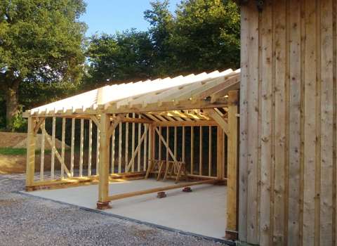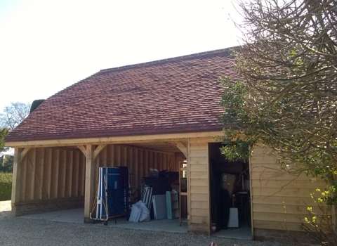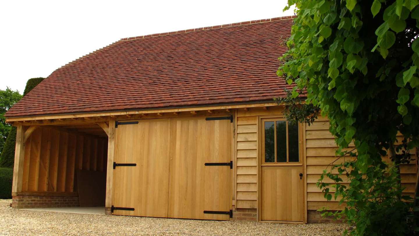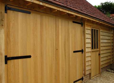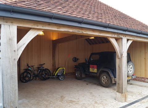 A simple 2-bay oak framed garage extension, clad in oak and with a corrugated roof, designed to match the barn it adjoins.
