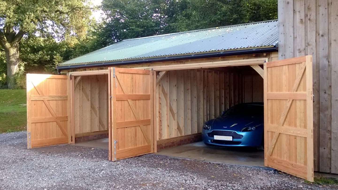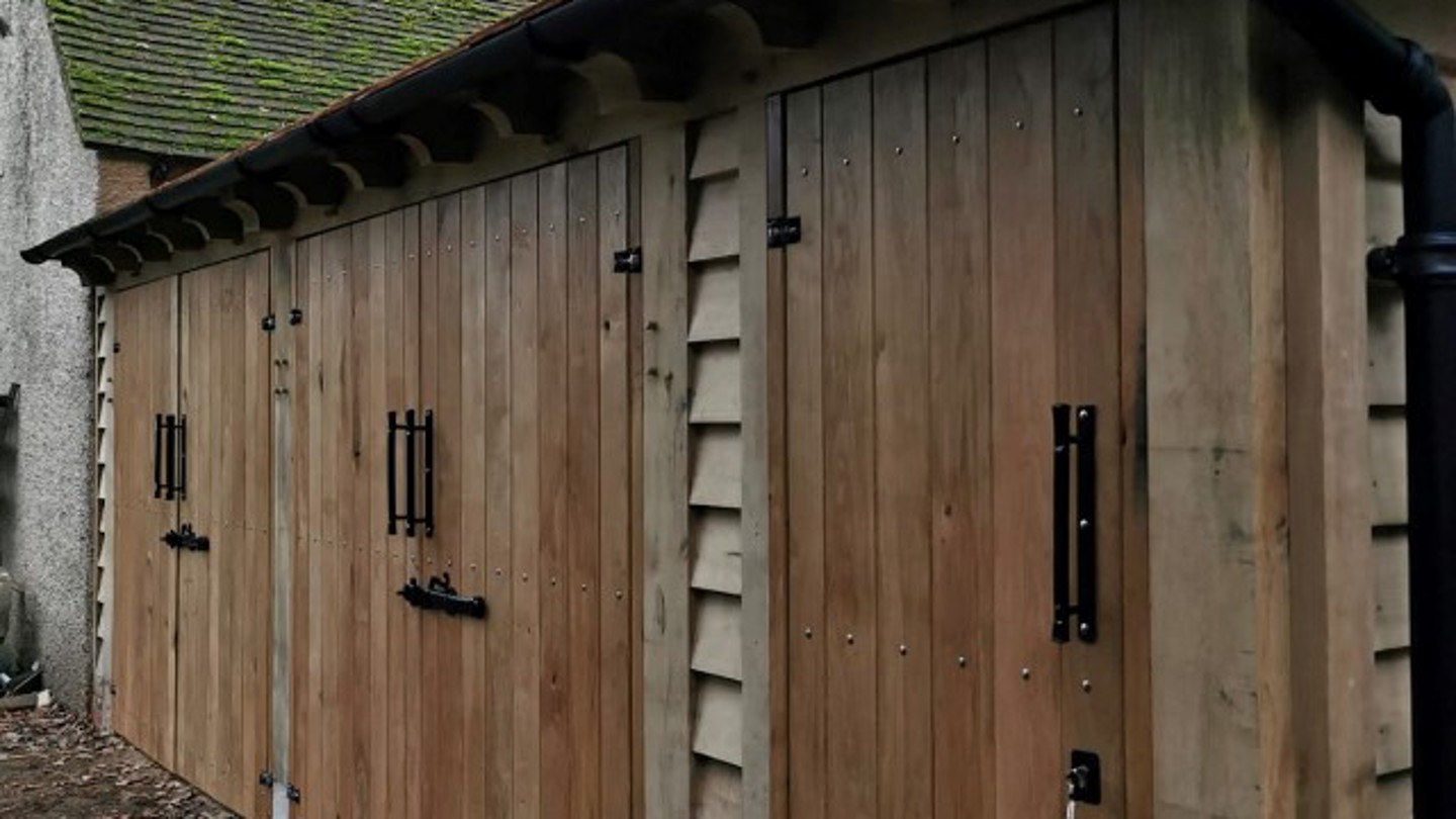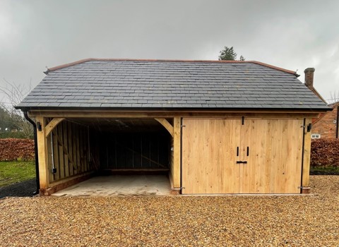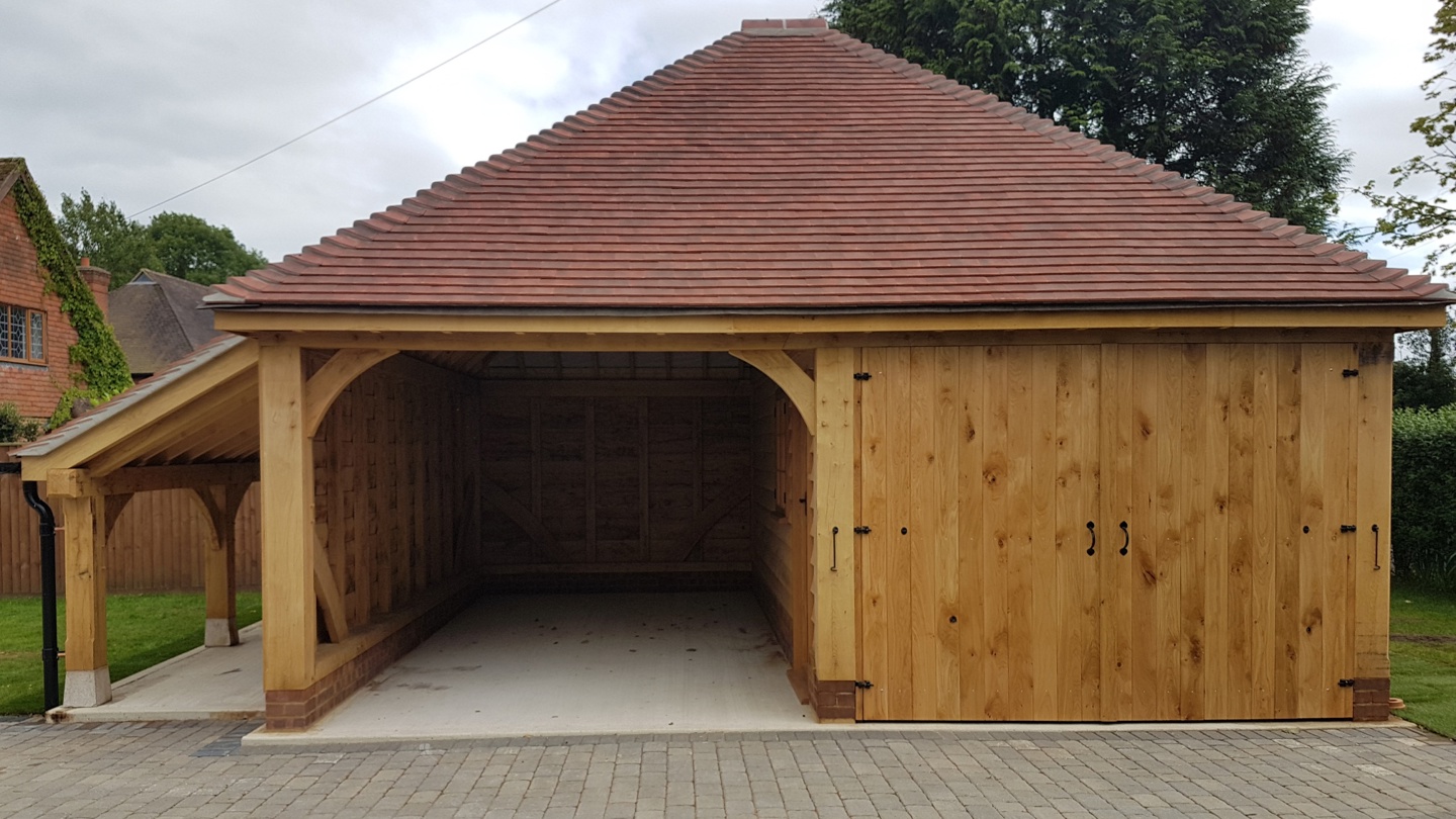 A 3-bay garage with loft floor above, a tiled roof and storage room. One bay features double oak doors with traditional ironmongery, the other remains as an open fronted car port.
