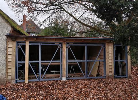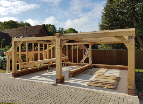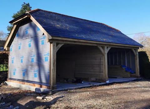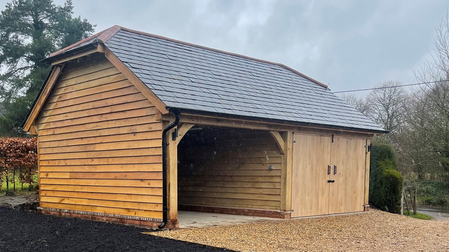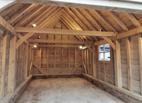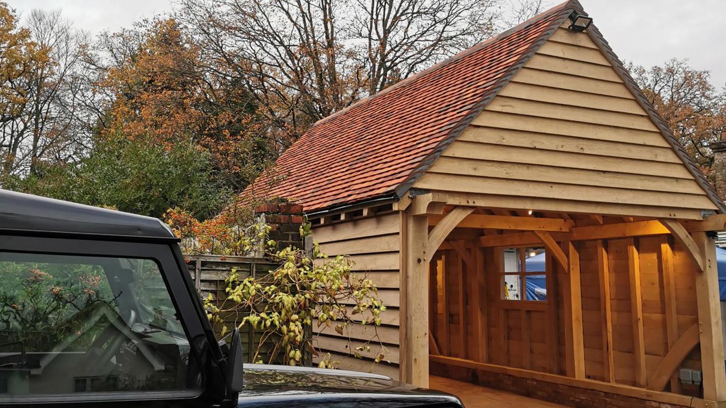 The frame goes up quickly...the finishes take a little longer! This beautiful single garage is oak through and through; with an oak frame, oak cladding, oak sarking boards and oak studs and rafters. The finished building sits on a low brick wall with a concrete floor, a clay tiled roof, a small side window, interior and exterior lighting and is fitted with power outlets inside.