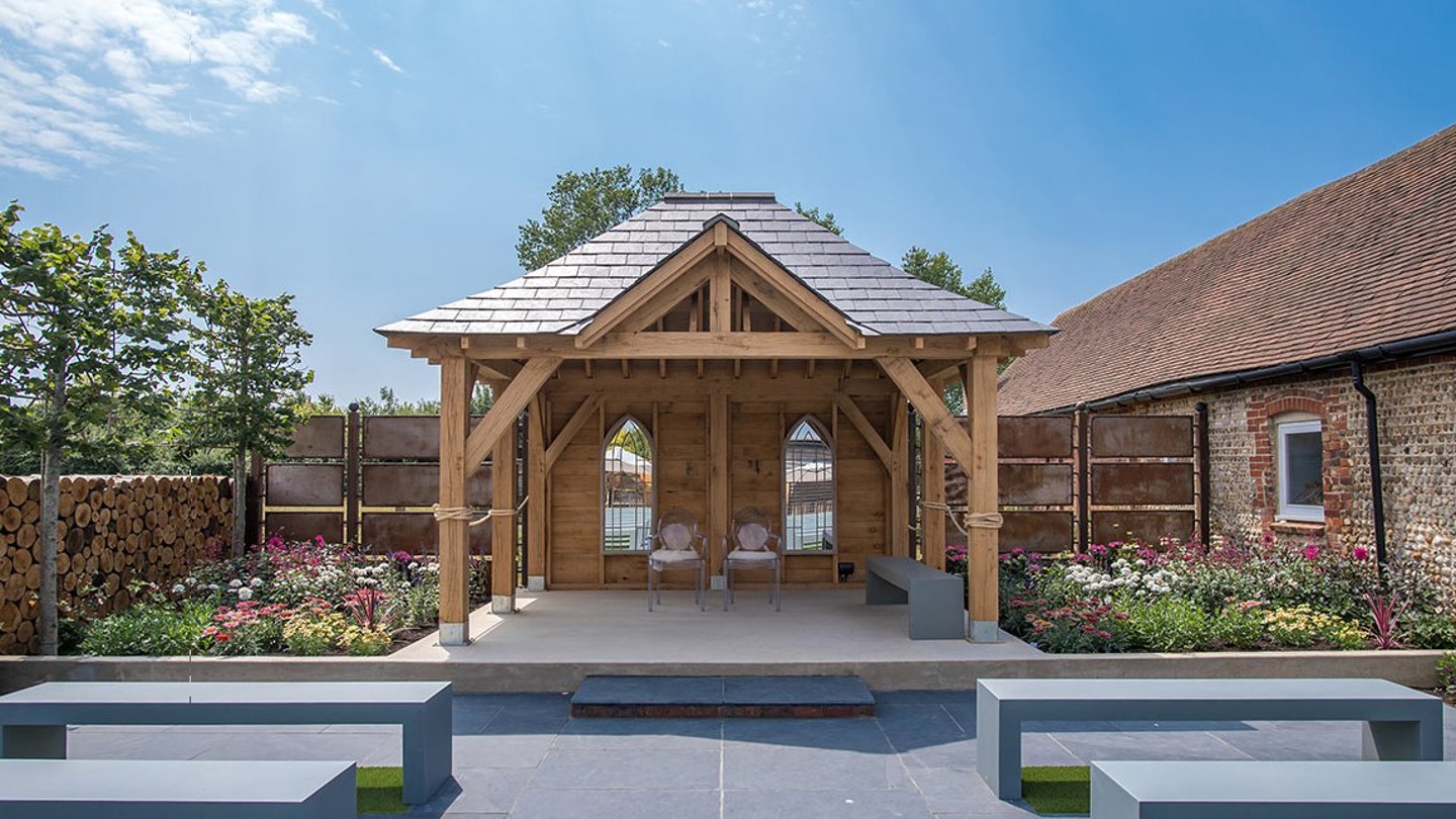 Our clients asked us to come up with a building that would be able to accommodate outside ceremonies at their award-winning wedding events venue outside Chichester. This is the oak-framed wedding pavilion we agreed on, which fits perfectly with the style and building materials already in abundance with their existing Threshing and Dairy barns.