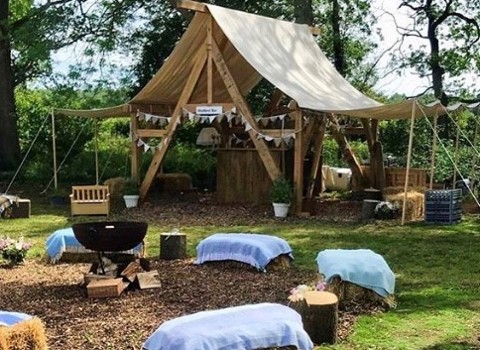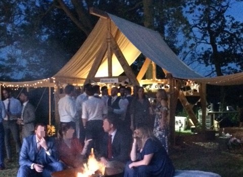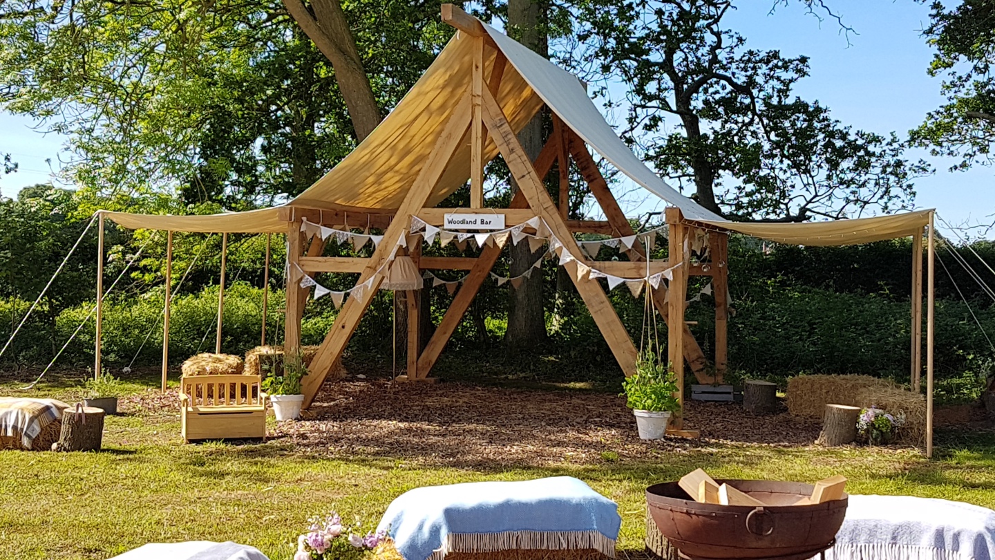 This canvas covered oak framed marquee has been specially designed for outdoor events, parties, weddings or BBQ's etc. Here it is set up in a rustic style for a wedding as a 'Woodland Bar' with fairy lights, hay bale seating and tree trunk tables, but it works equally well with a formal table setting and chandelier lighting. The sides can be rolled up or extended (as shown here) and it is available for hire for your event...