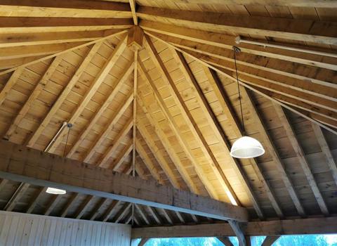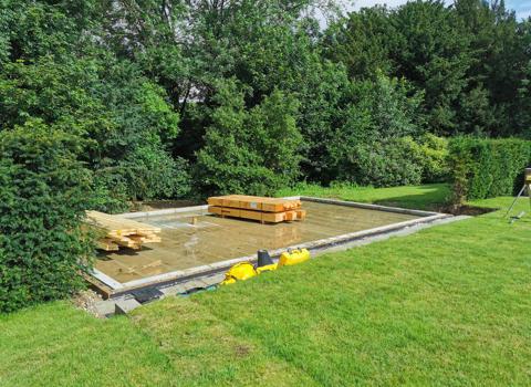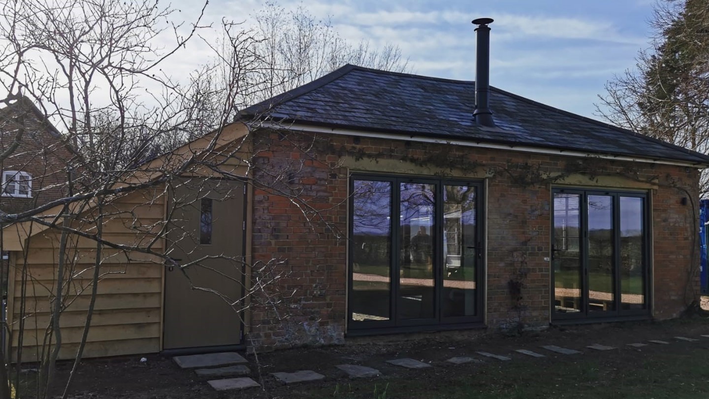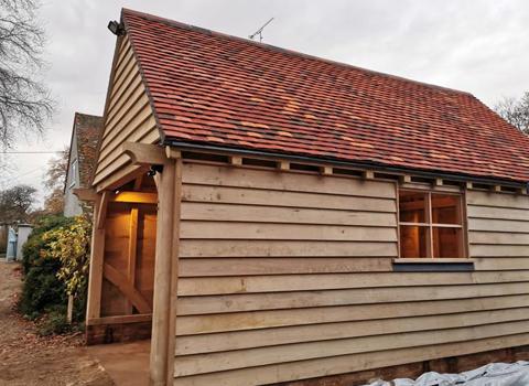It took just one week to put up the shell of this 10m x 6m gym/party barn in dry weather. Reclaimed roof tiles help it settle into its surroundings, seen here before we moved on to the exterior cladding and interior fit out.