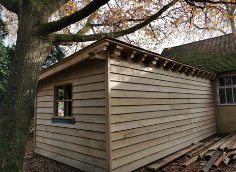 We've knocked down a derelict wooden structure that was attached to this building and replaced it with this oak framed, shingle roofed, weatherproof store room. It features a range of bespoke doors made of steel frames dressed with tongue and groove cladding and handmade ironmongery, to provide secure and flexible access to the new space, whilst still maintaining a traditional look and feel to the outside.