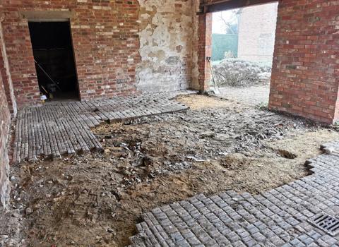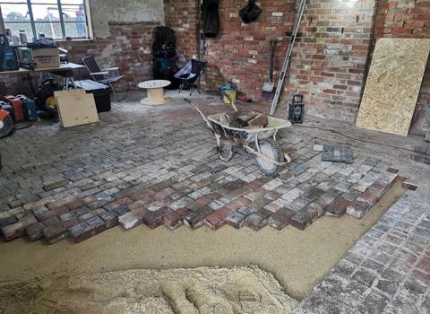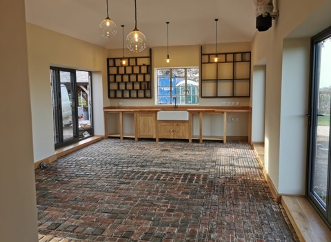 One of the first jobs we tackled during the conversion of this beautiful old garage into a usable working space was to level out the uneven floor. Made up of an assortment of odd shaped and sized cobbles, we lifted each one and re-laid them to re-create a safer and more stable floor. We then opened up the brickwork to install two large sets of bifold doors and a created a new entrance doorway to make best possible use of the available space.