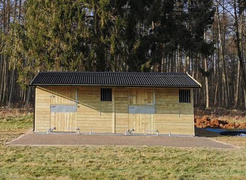 Whilst we work on the designs for a more permanent and substantial stable block, we have installed these mobile 2 bay stables to provide our clients with an immediate and effective temporary solution. With two further sheds attached to the back for additional storage, a solar lighting system inside and out and all painted a dark shade of green, we think they look pretty good!
