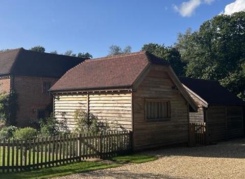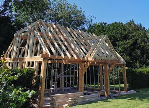Here we’ve provided the oak frame and softwood carcass for a 2-bay lofted garage addition to a listed property on the high street in Odiham.