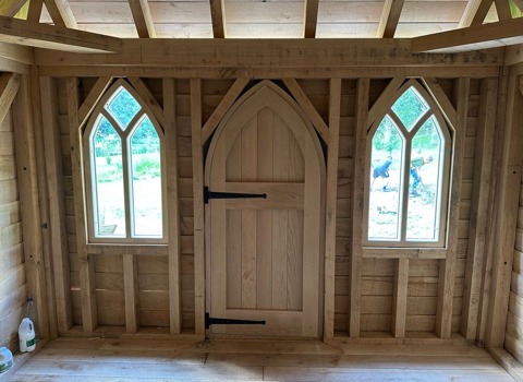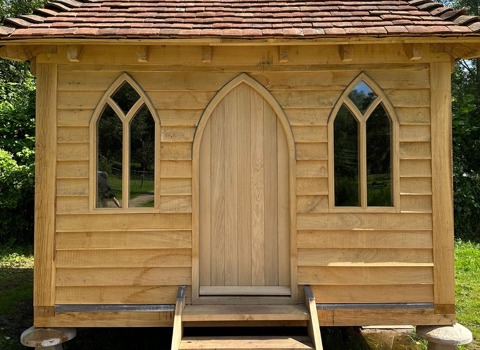 This 3m x 3m building was built by the team near Stonehenge (during the summer solstice no less). Our clients commissioned it to be used as an apple store with handmade gothic style windows and doors designed to mirror the style of those on the main house. It also has a 4-way hipped roof with reclaimed tiles, oak sarking boards above the rafters and oak flooring within and has now been fitted with a range of slatted open shelving for the apples!