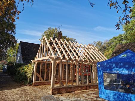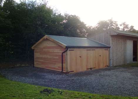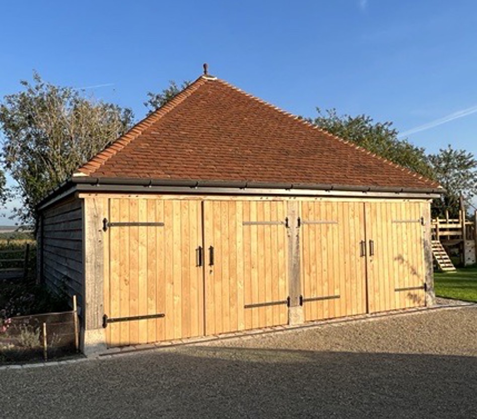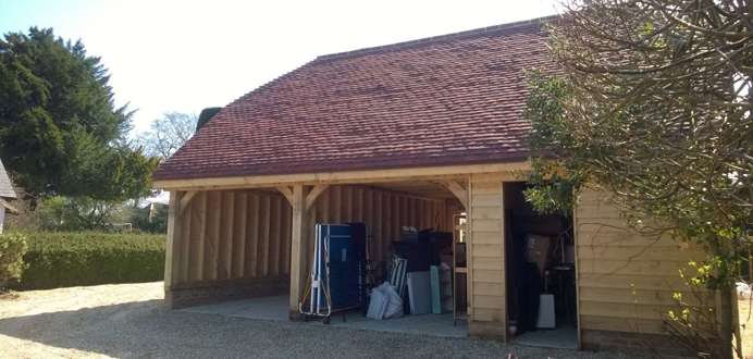 A simple 2-bay oak framed garage extension, clad in oak and with a corrugated roof, designed to match the barn it adjoins.